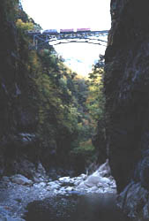 とくに「トロッコ電車」の愛称で親しまれる渓谷鉄道は、気軽に絶景を楽しめるお勧めスポット。窓や壁のない開放型の客車からは、春・夏・秋と折々の渓谷美を楽しめ、時には対岸の岩場に遊ぶカモシカや原生林に群れる野猿たちとの思いがけない出会いもあります。 昭和39年に国の特別名勝、特別天然記念物に指定されています。